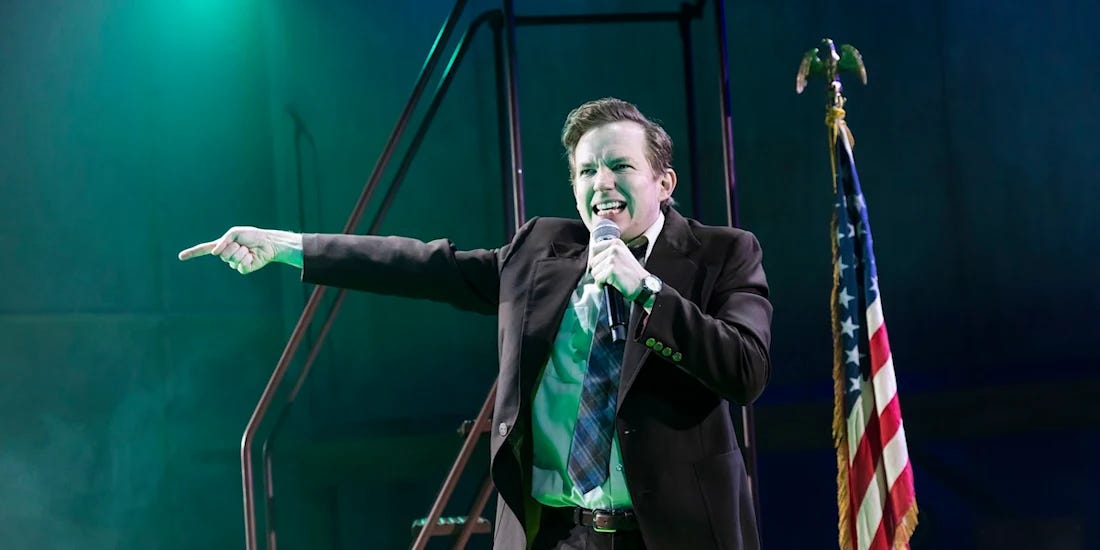 KENREX is a highly innovative show which pushes boundaries of traditional theatre, taking the tired tropes of ‘true crime drama’ and pulling off a magic trick. Based in the small Missouri town of Skidmore, actor and co-writer (with director Ed Stambollouian) Jack Holden brings its inhabitants to life, slipping between dozens of precise characters with a frenetic energy, interchanging and interrupting himself like a man possessed.